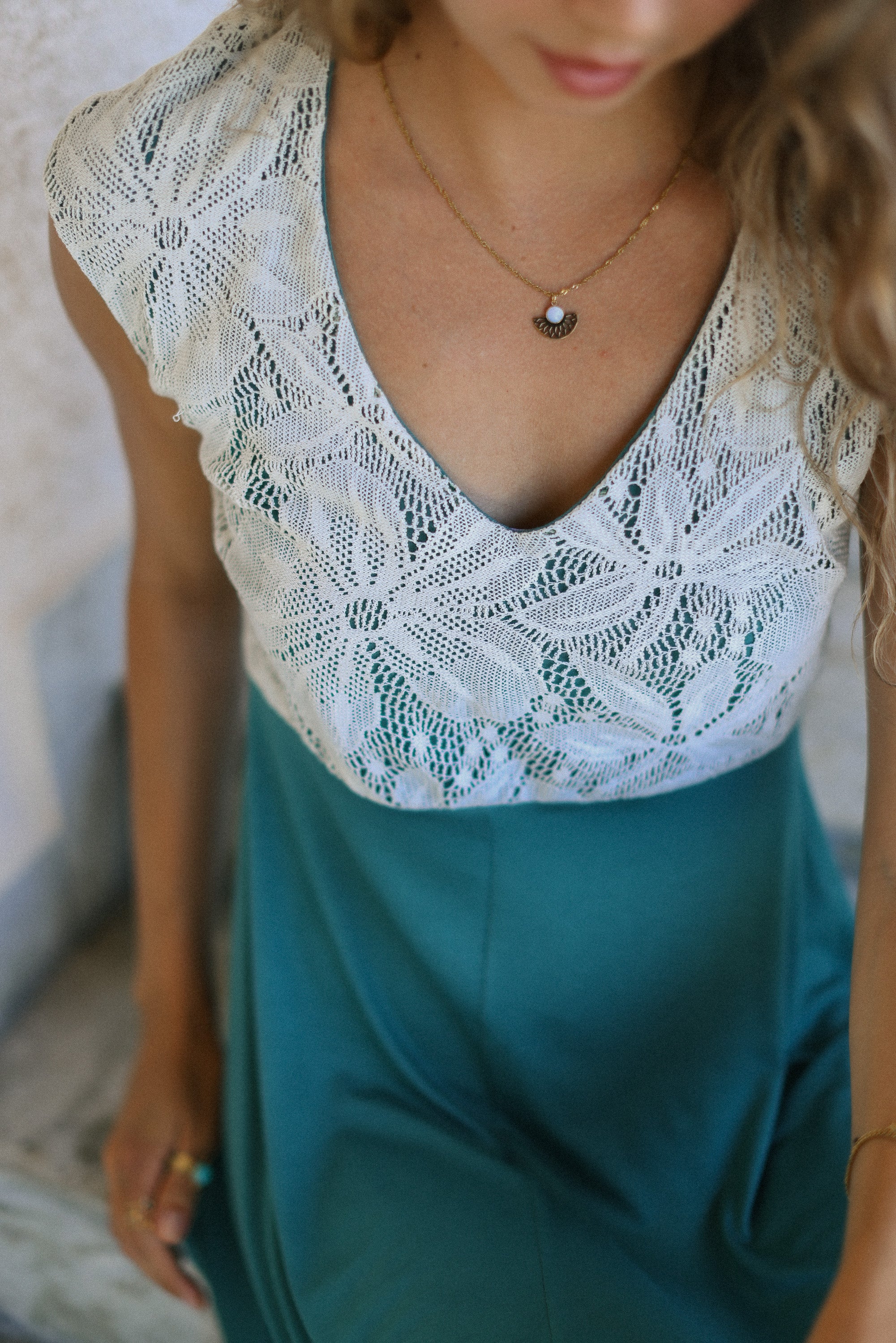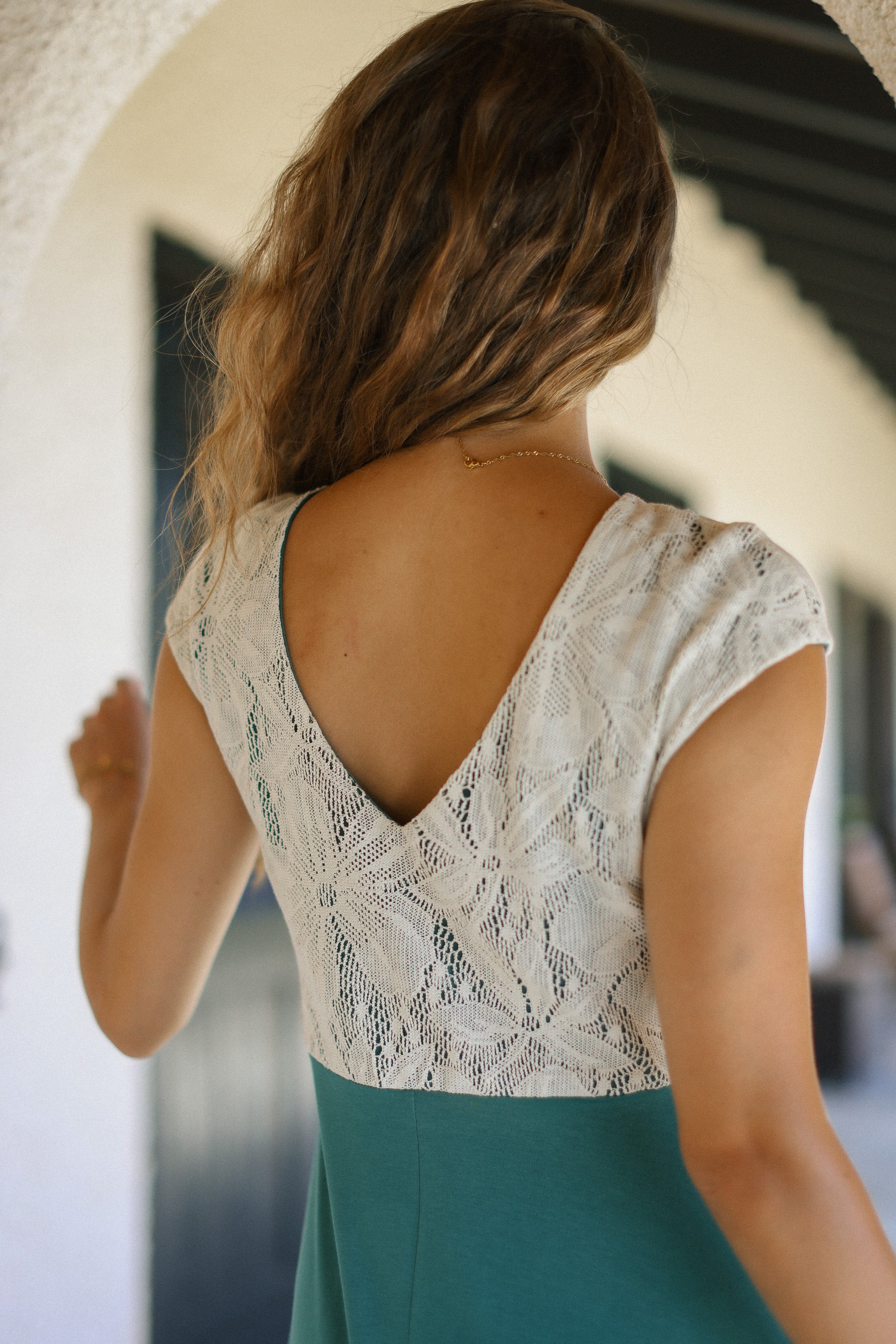 Bring deinen Style auf das nächste Level mit dem Kleid Vesiene Green! Dieses vielseitige Kleid kannst du sowohl mit dem V-Ausschnitt vorne als auch hinten tragen. Das florale Spitzentop, der grüne Rockteil und die Retro-Ärmel machen es zur perfekten Wahl für einen verspielten und einzigartigen Look. Kombiniere es mit weißen Sneakern oder flachen Sandalen für maximalen Spaß!