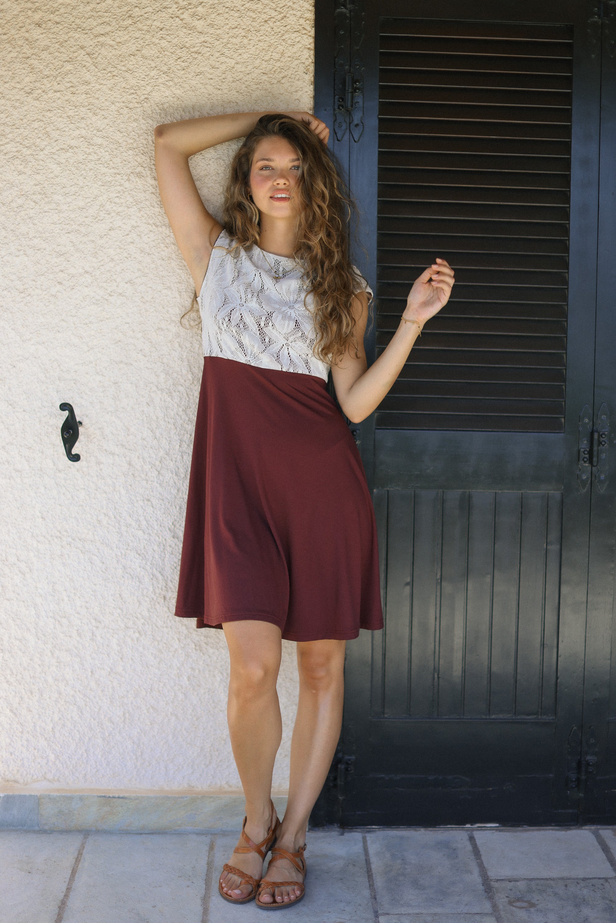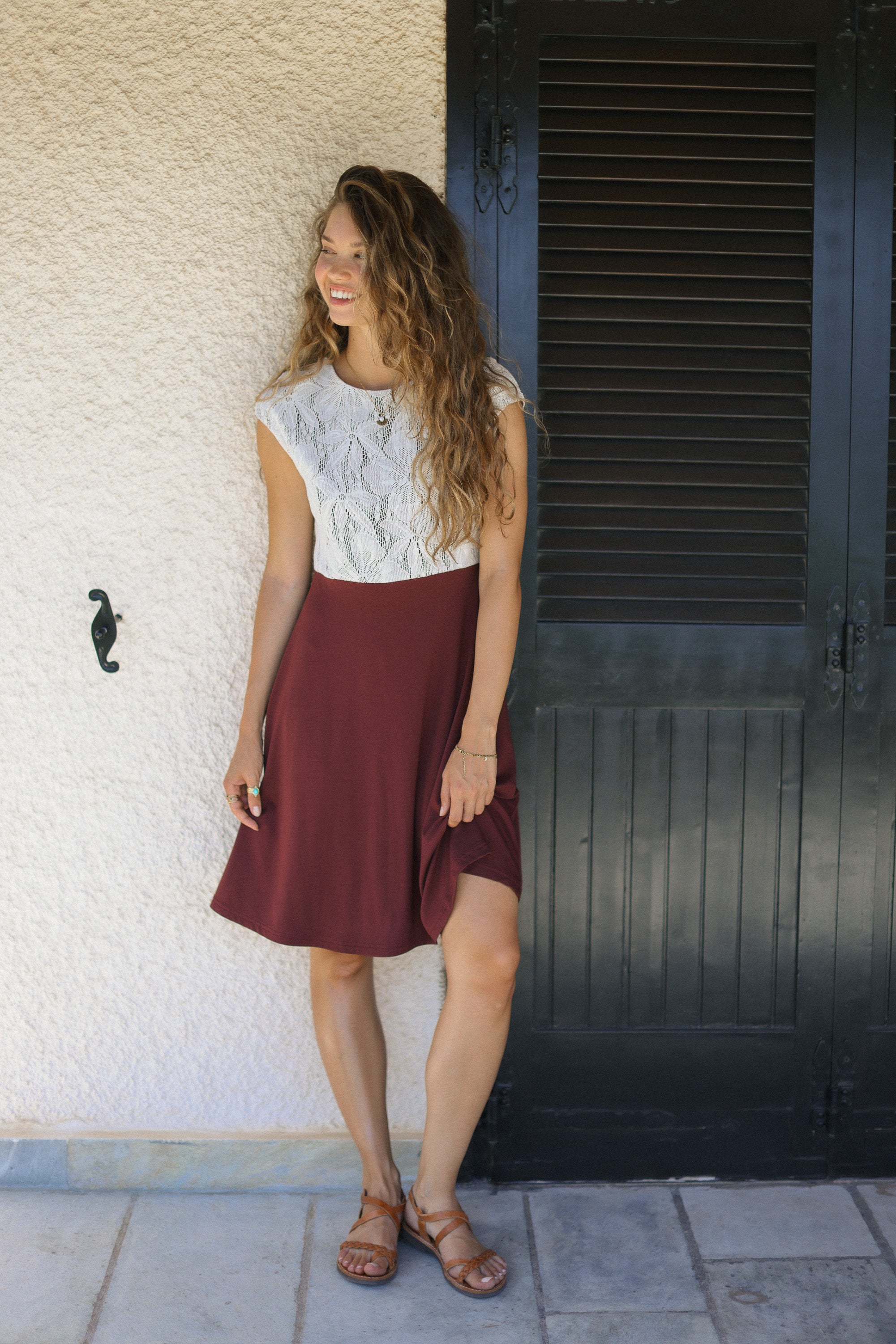 Dieses vielseitige Kleid kann mit dem V-Ausschnitt vorne oder hinten getragen werden. Mit seinem floralen Spitzentop, dem maroonfarbenen Rock und den Retro-Ärmeln ist es die perfekte Wahl für einen verspielten und einzigartigen Look. Kombiniere es mit weißen Sneakern oder flachen Sandalen für extra Spaß!