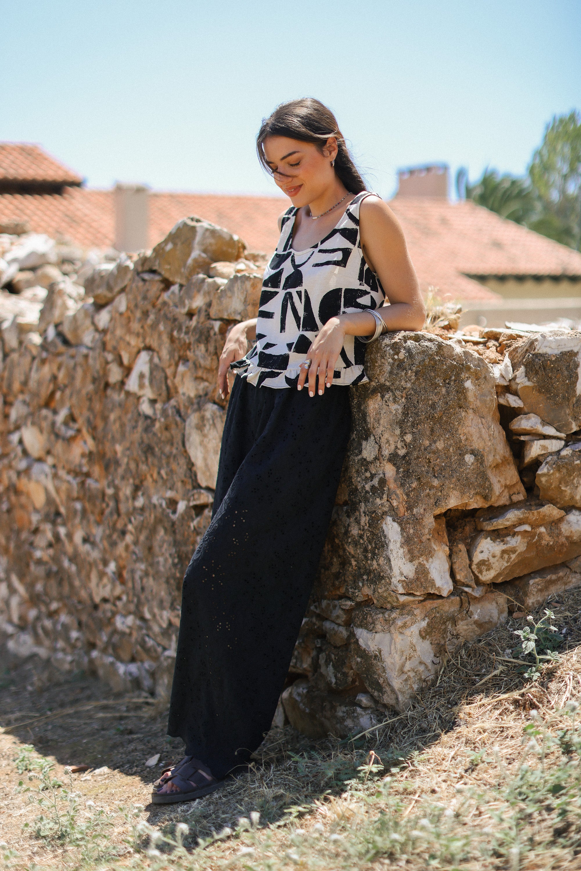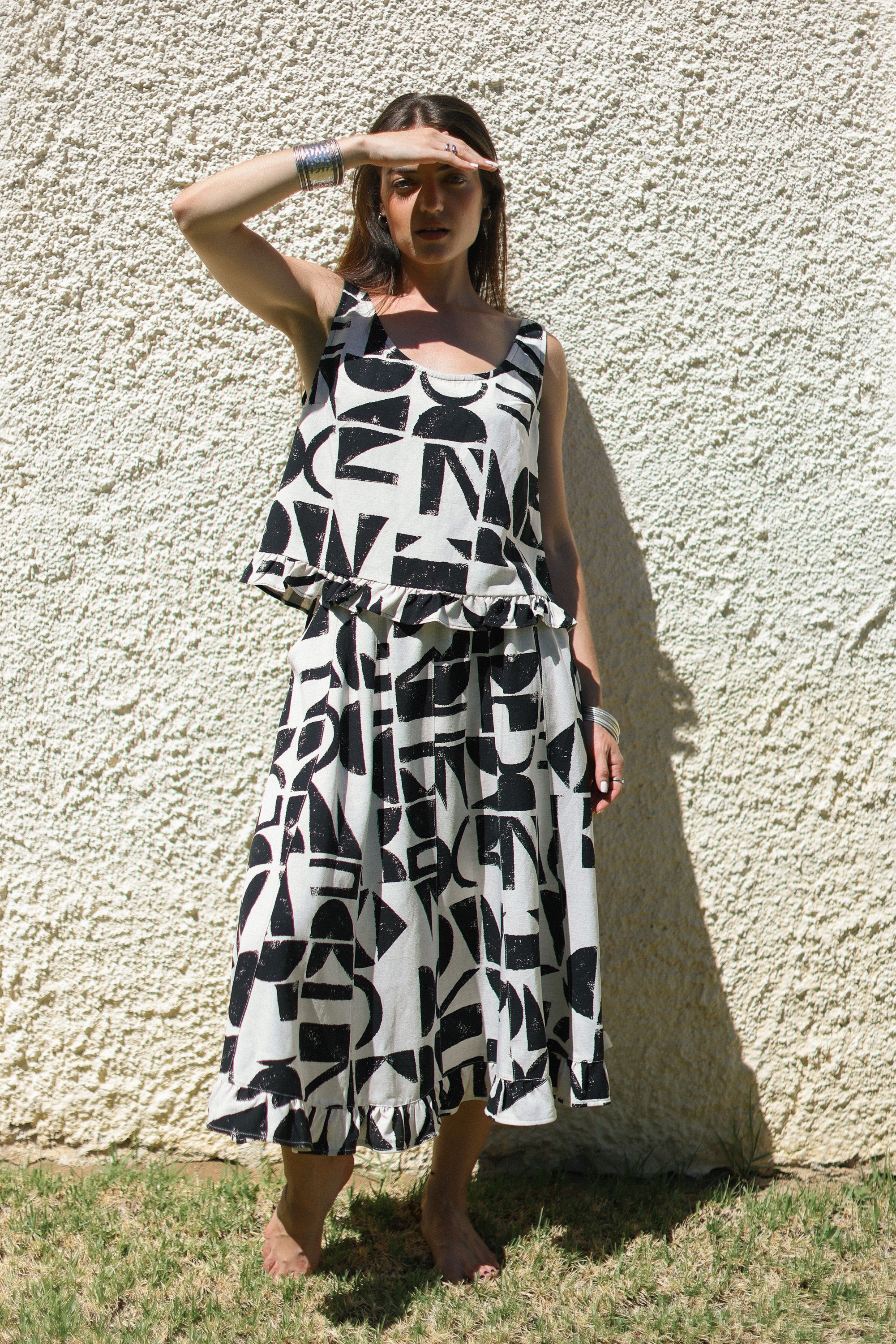 Mit seinem geraden, lockeren Schnitt, verspielten Rüschen an den Abschlüssen und einem offenen Rücken mit dekorativen Holzknöpfen verbindet dieses Top klare Formen mit natürlichen Details – für einen frischen, mühelosen Style. Perfekt kombinierbar mit dem Rock Vaiana Geometric.