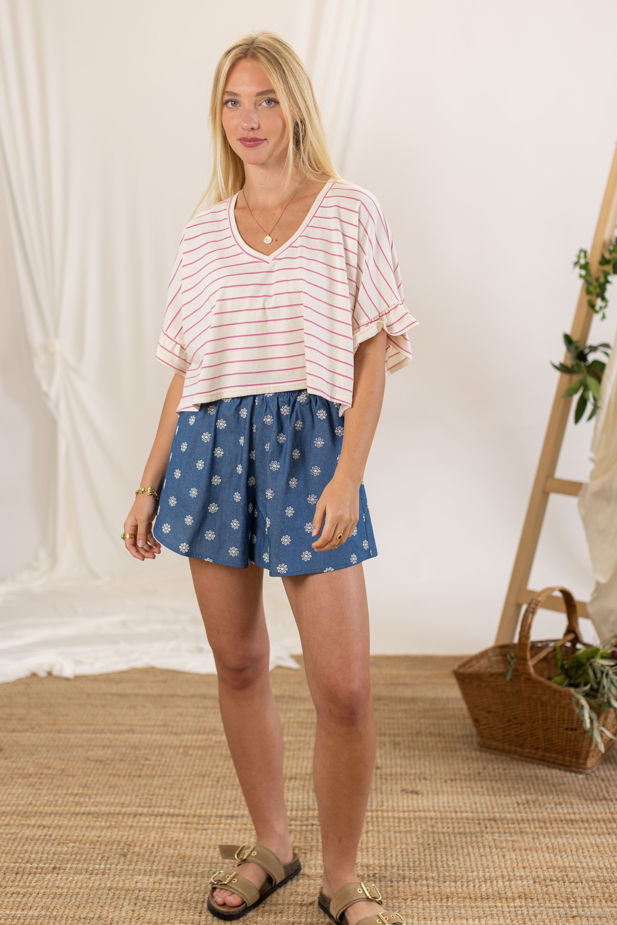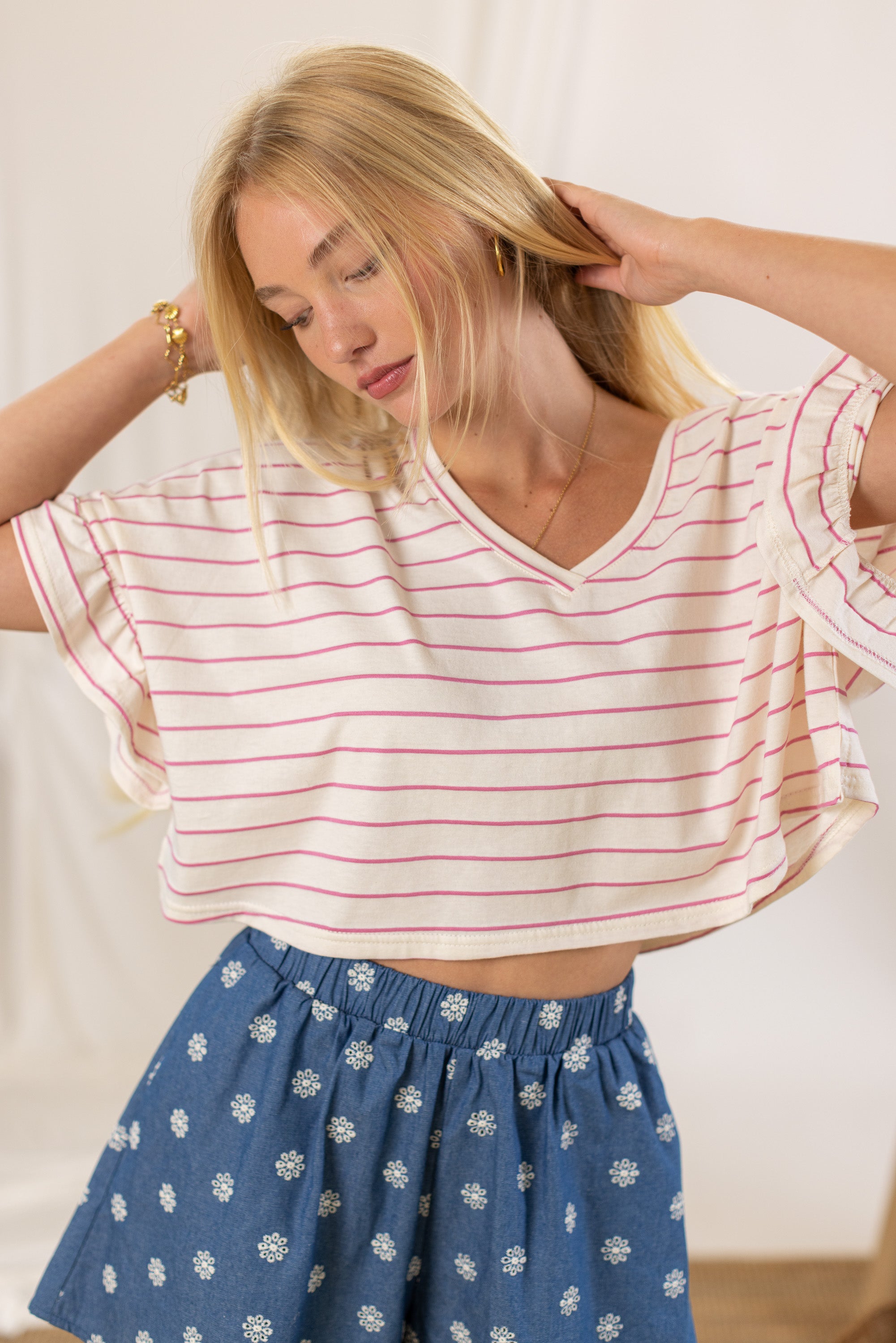 Das Rosienne Magenta Stripes Top ist ein stilvolles, bauchfreies Oberteil mit schmeichelhaftem V-Ausschnitt. Hergestellt aus weichem, atmungsaktivem Stoff und mit verspielten Rüschenärmeln versehen, verleiht es jedem Look eine feminine Note. Perfekt für einen mühelos stylischen Auftritt!