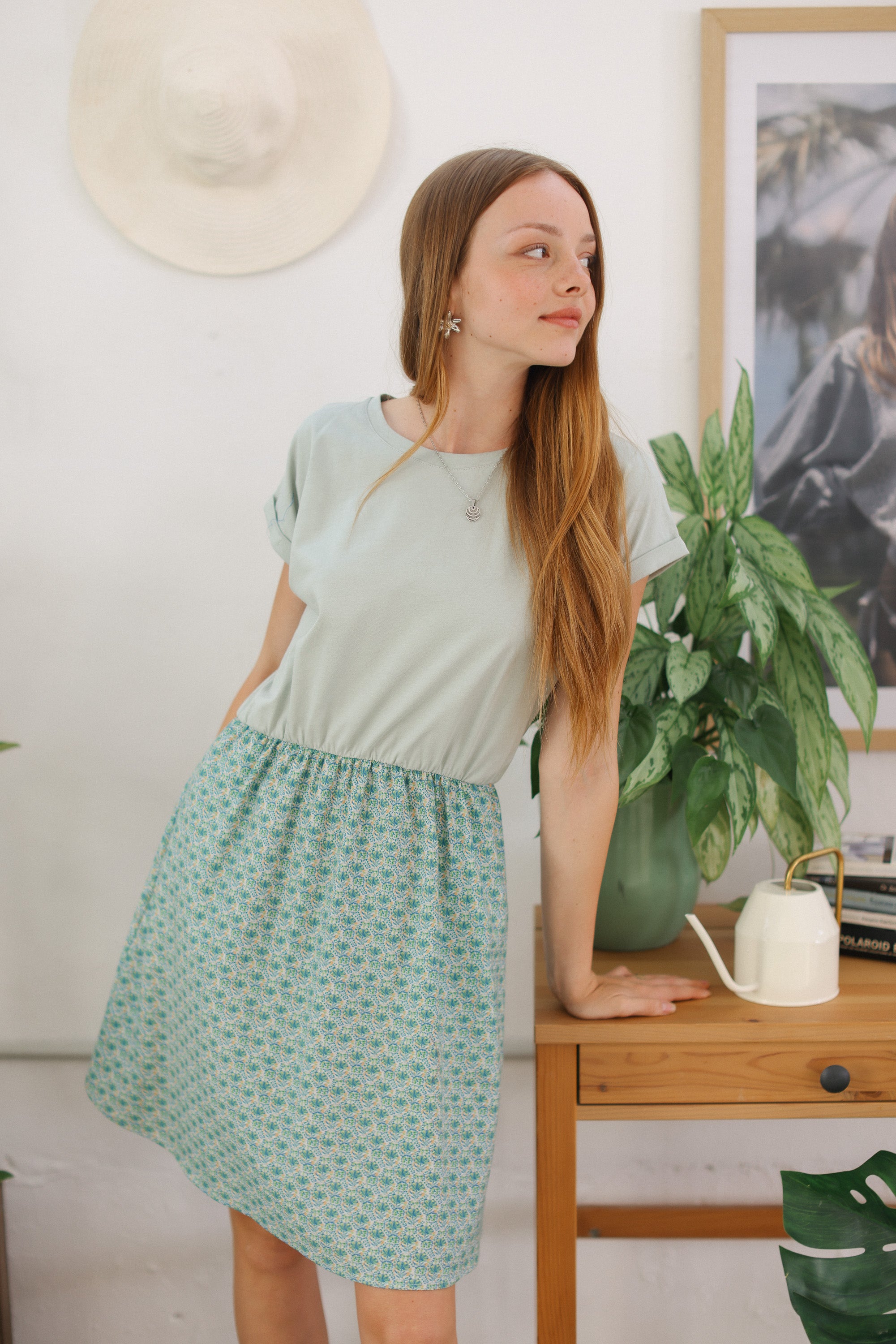 Get ready to turn heads in the Dress Annie Mint Leafs! With its regular fit and mini length, this dress is perfect for any occasion. The elastic waistband ensures a comfortable and flattering fit, while the mint top and Leaf patterned skirt add a fun and playful touch.