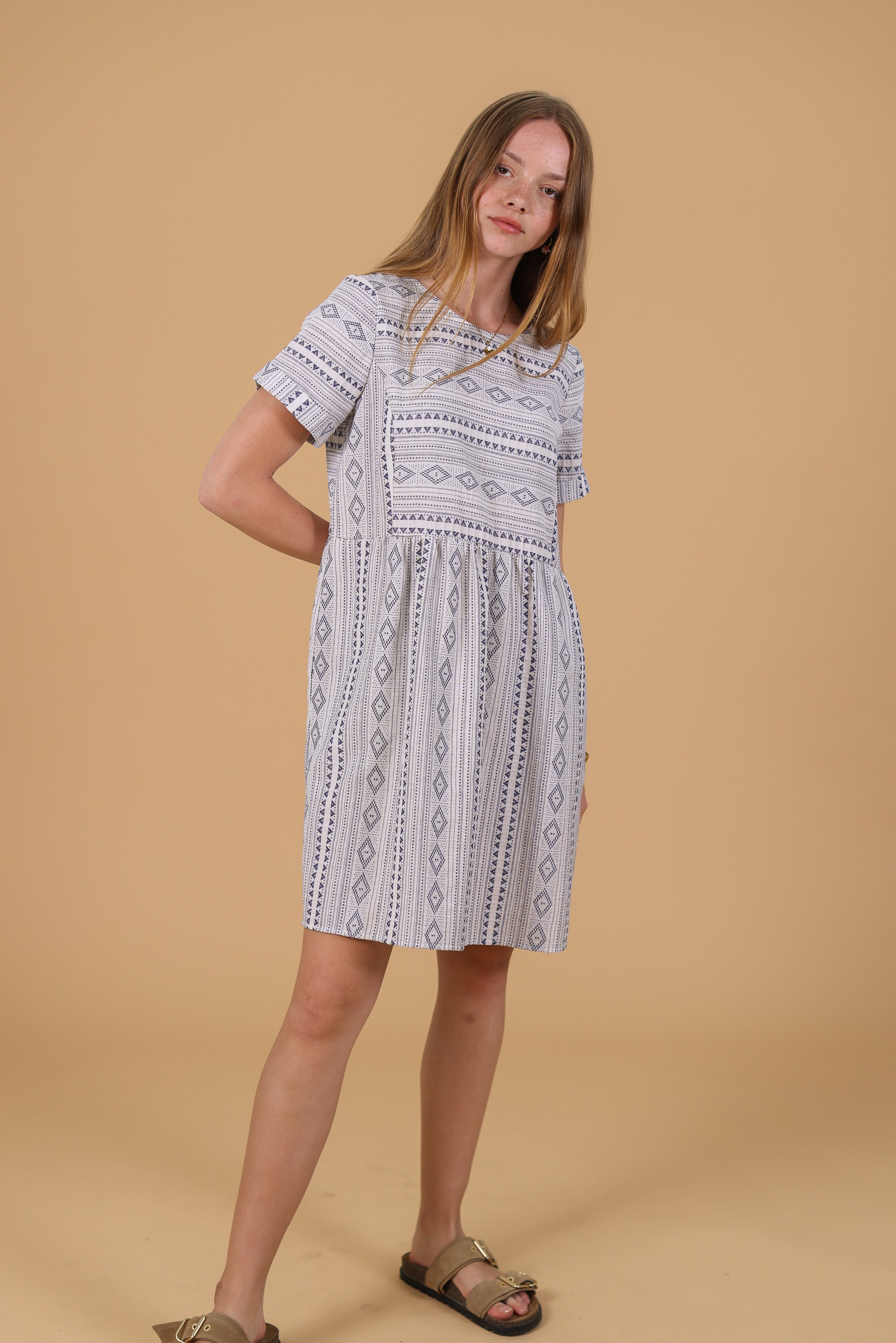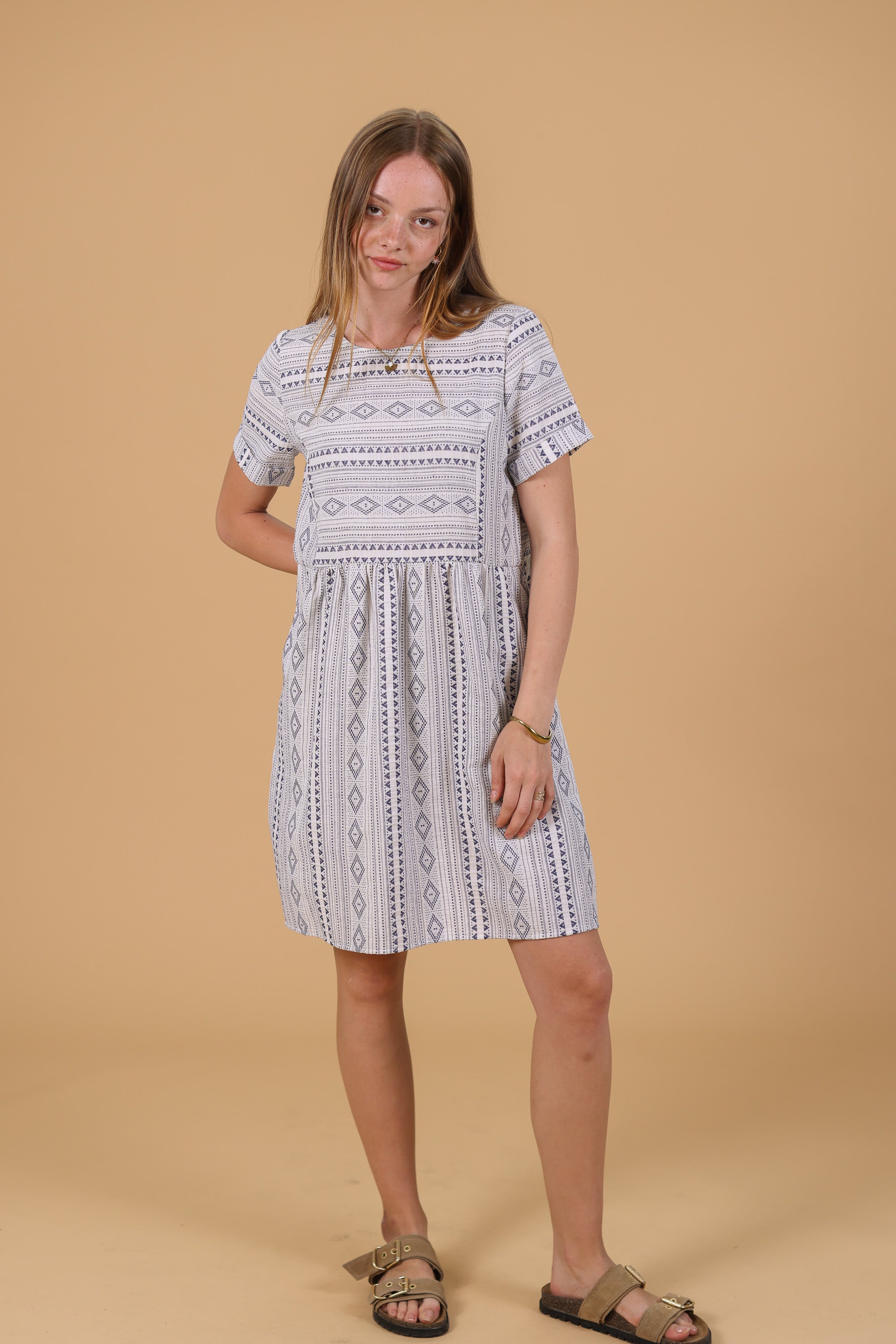 The Isla dress features a shortsleeved design with a cute button on the back and geometric striped pattern. The rolled up sleeves and the loose fit of the skirt make it super cute and comfy. Matches perfectly with your favourite flat sandals.