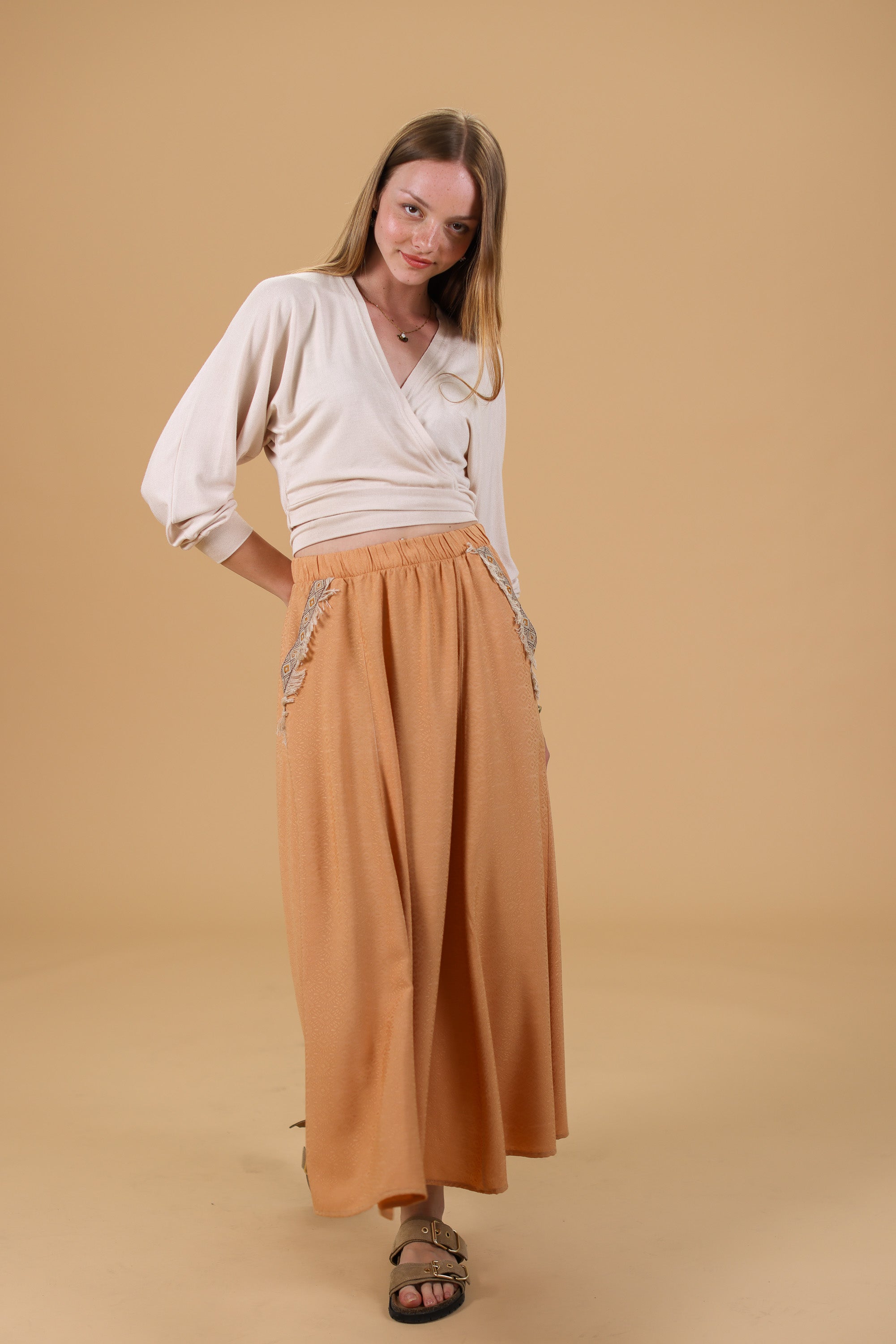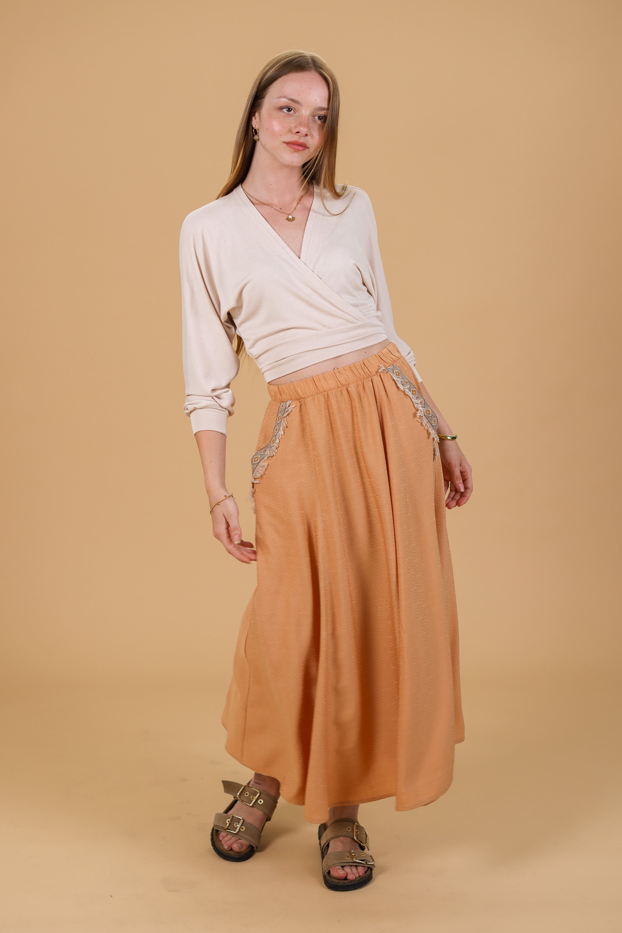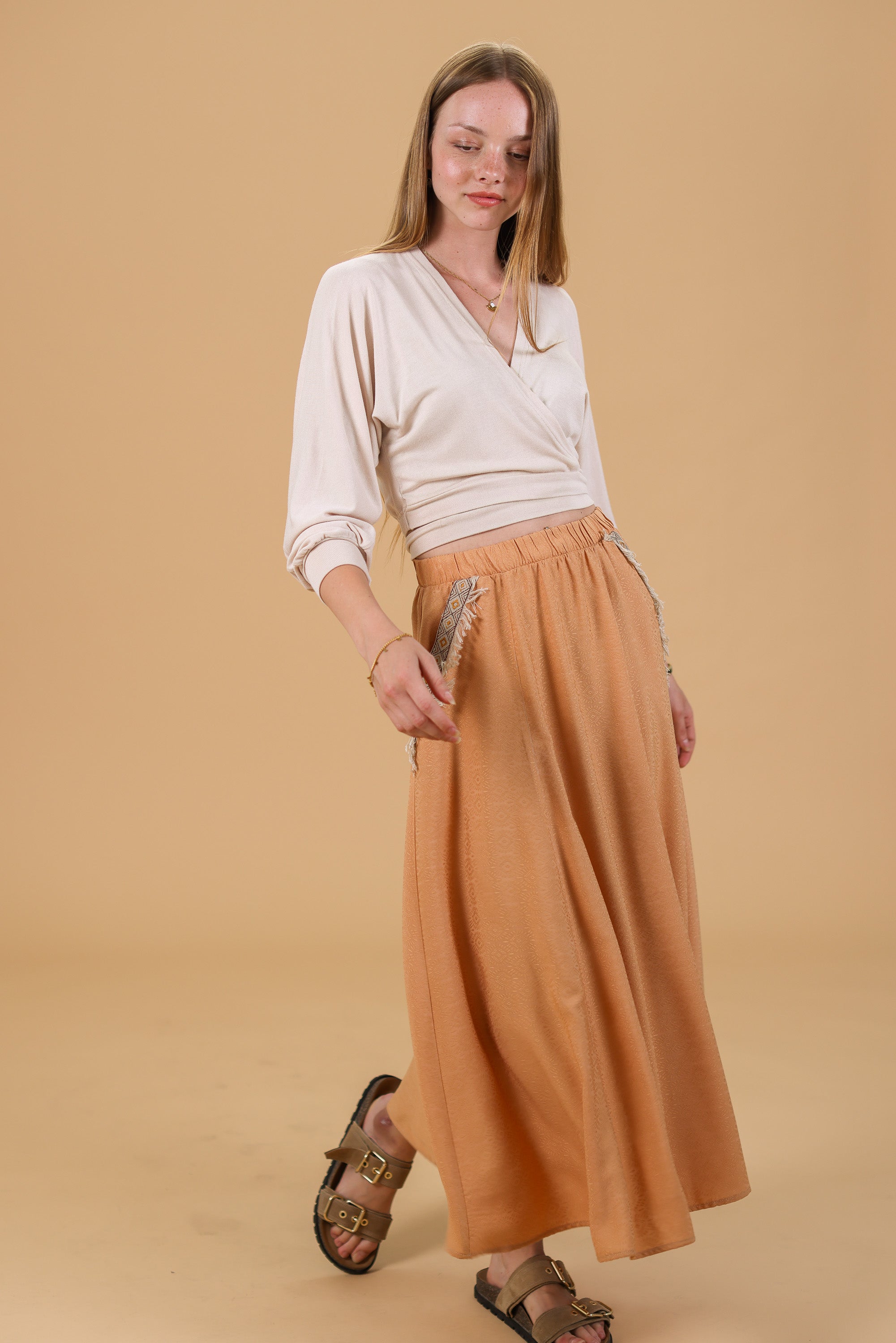 This maxi skirt offers a breezy, relaxed fit you'll adore. Thanks to its stretchy waistband, you can say goodbye to any tightness, and the handy side pockets add extra charm. Crafted from a beautiful textured boho fabric, it’s a chic and fabulous piece to add to your closet!