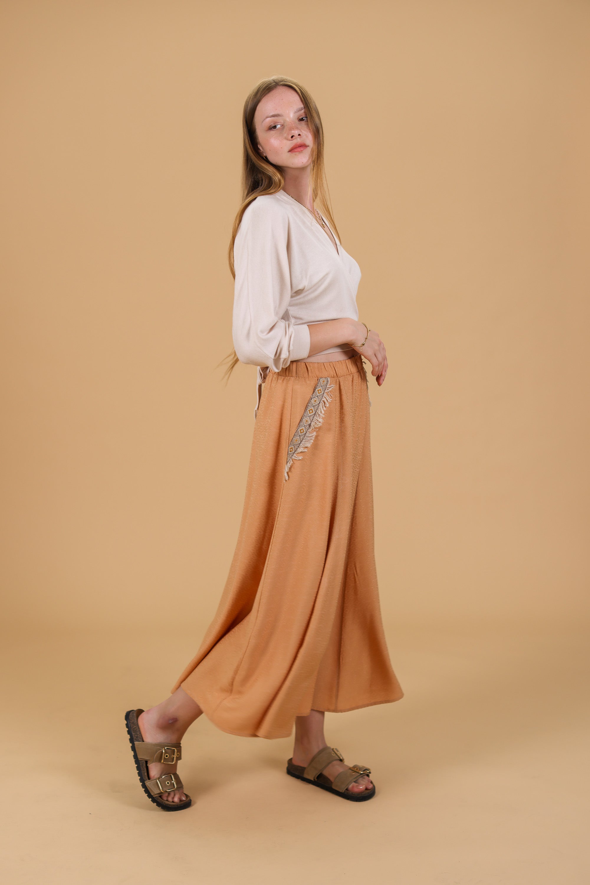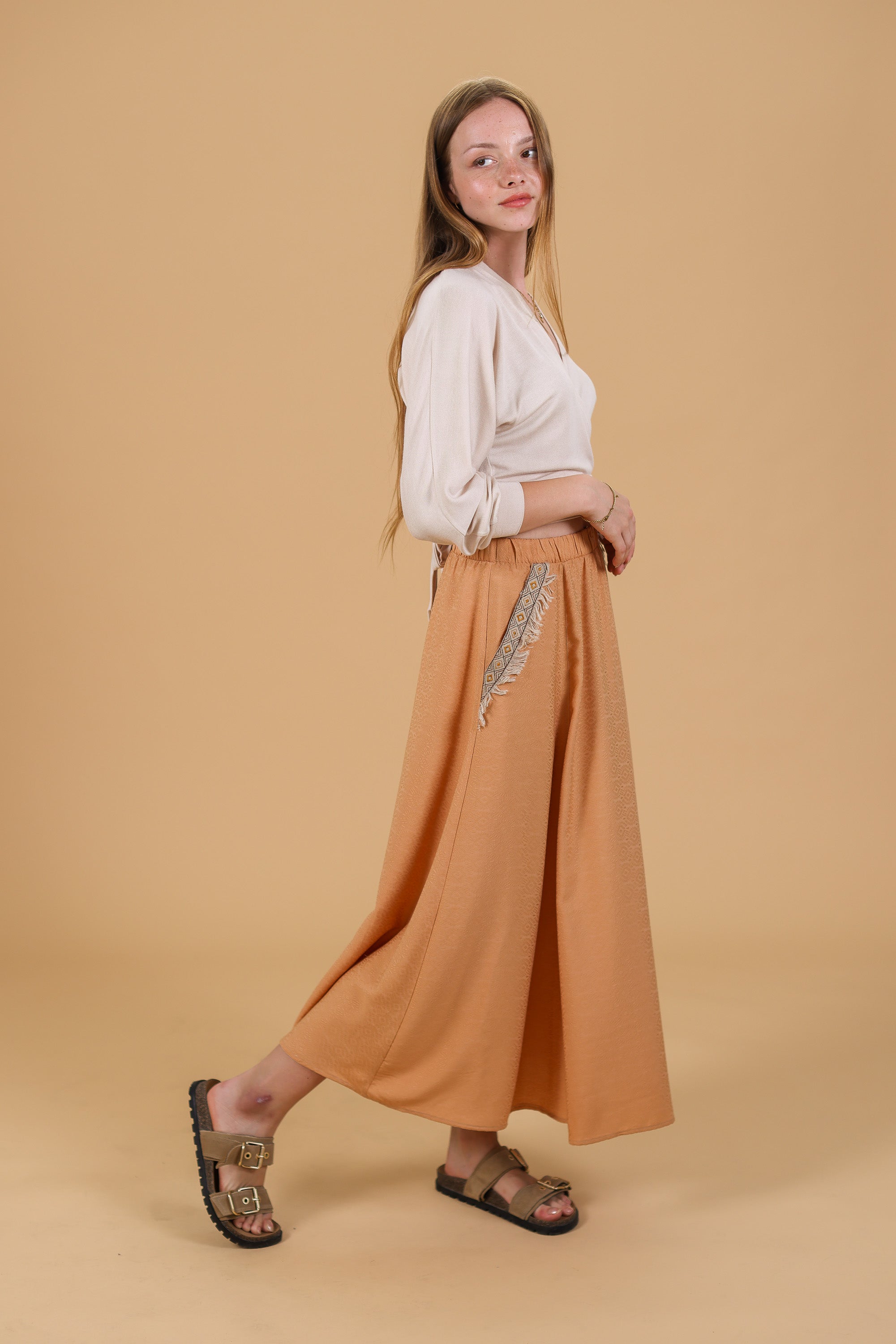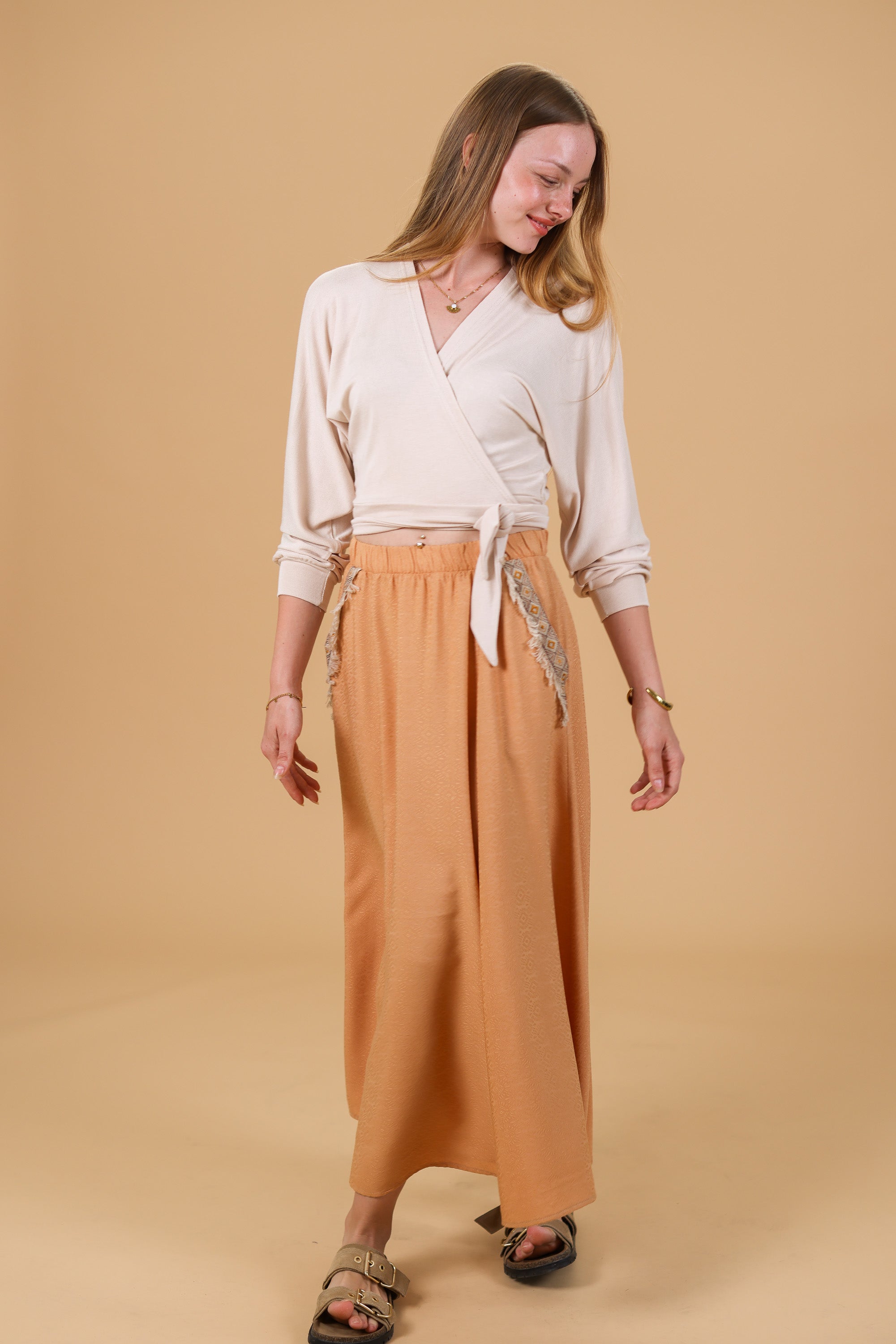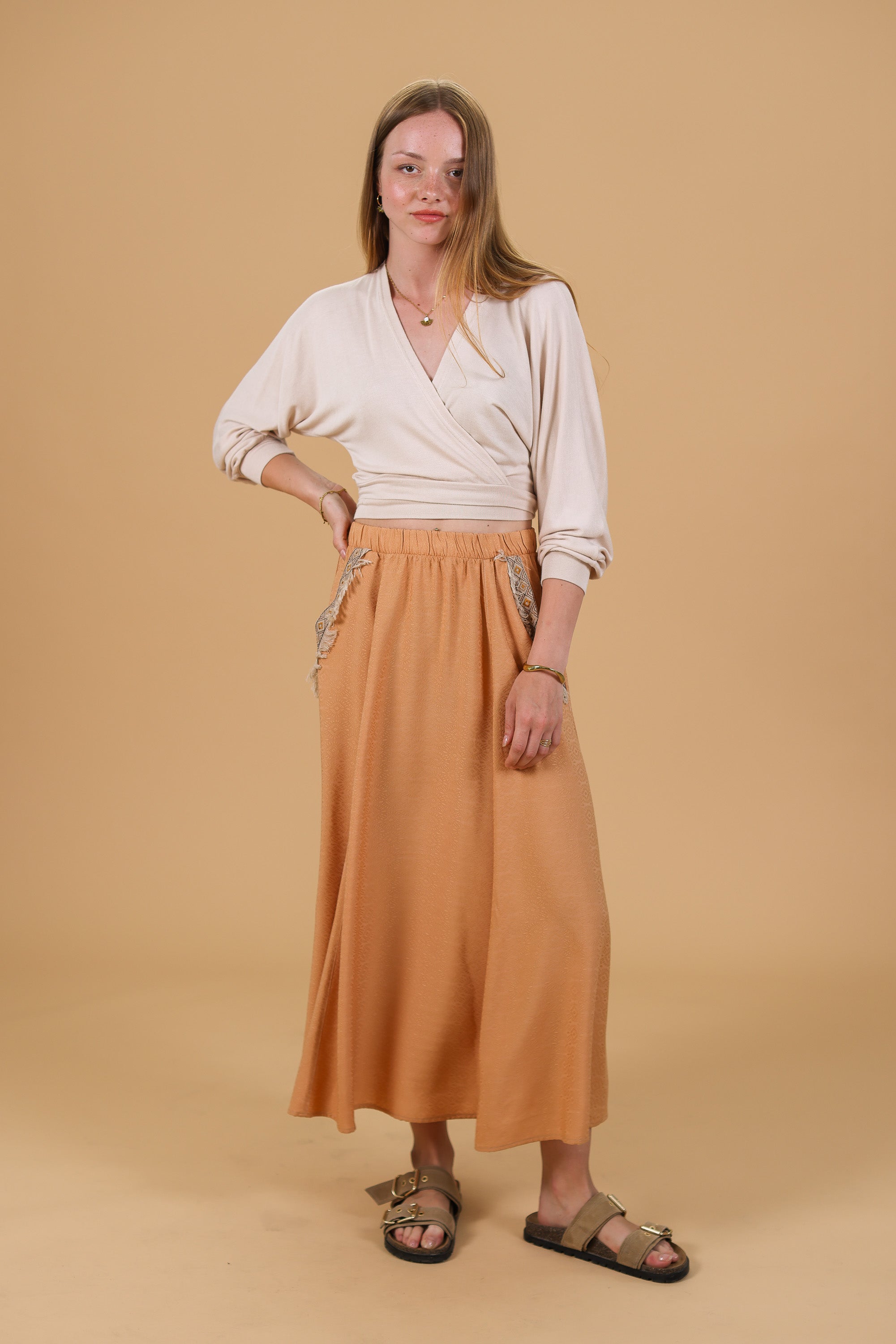 This maxi skirt offers a breezy, relaxed fit you'll adore. Thanks to its stretchy waistband, you can say goodbye to any tightness, and the handy side pockets add extra charm. Crafted from a beautiful textured boho fabric, it’s a chic and fabulous piece to add to your closet!