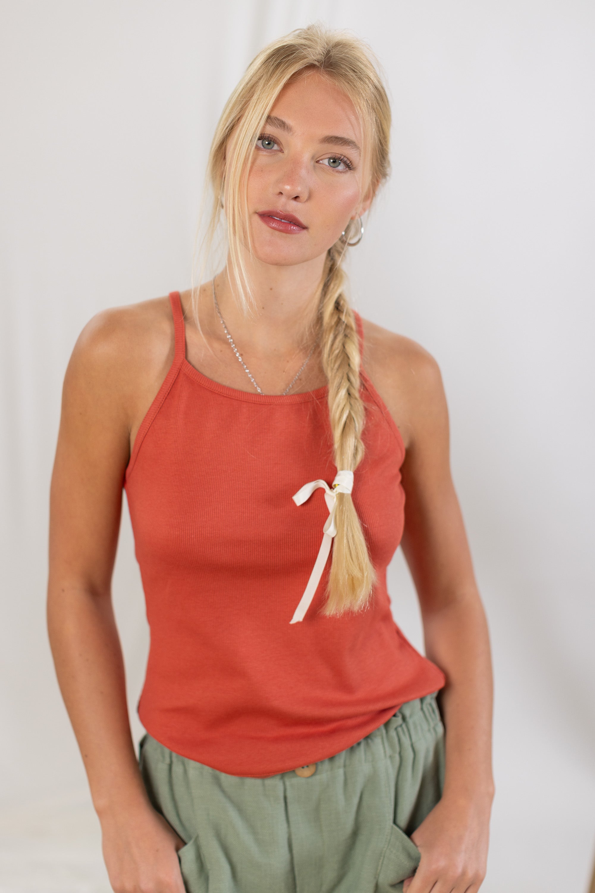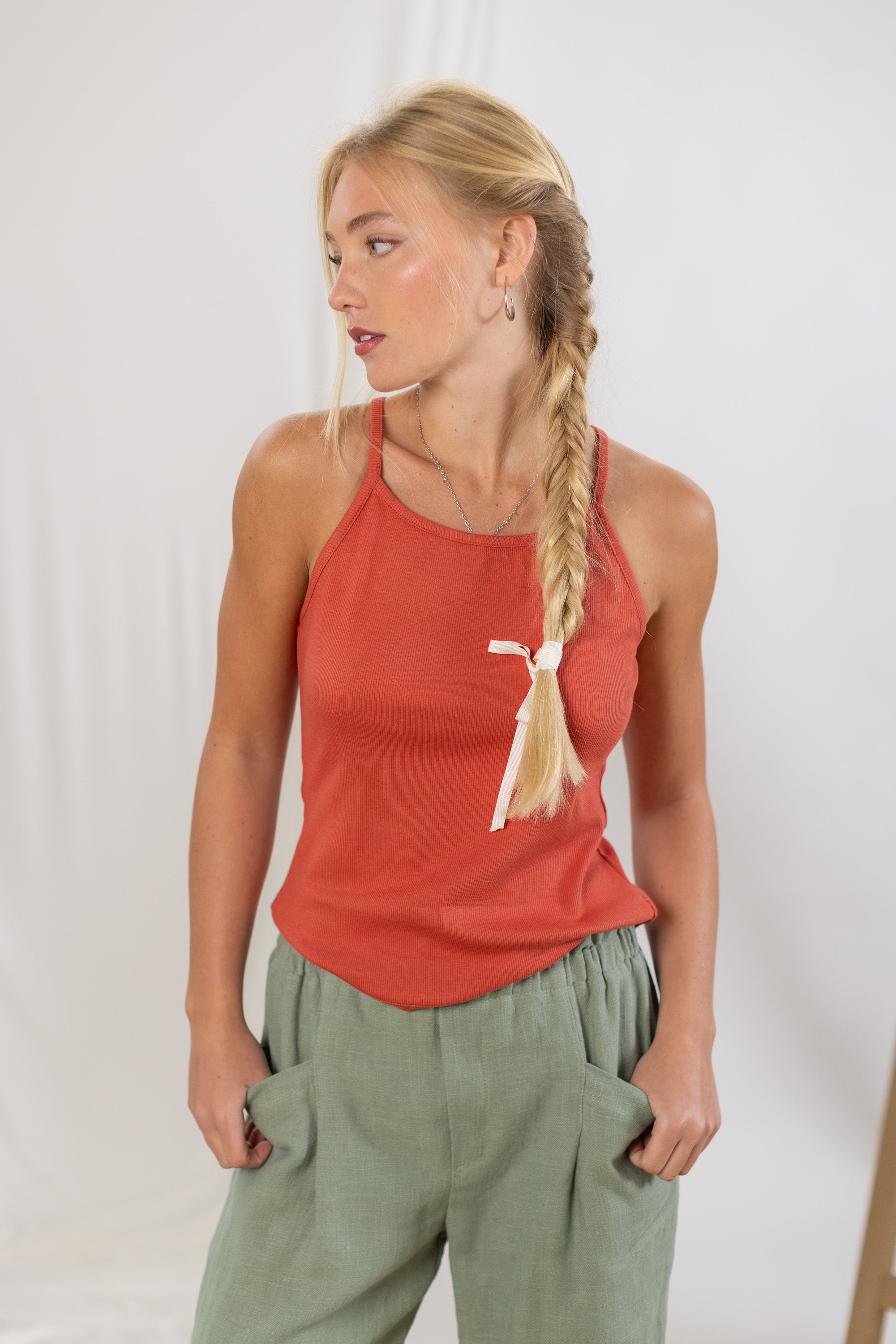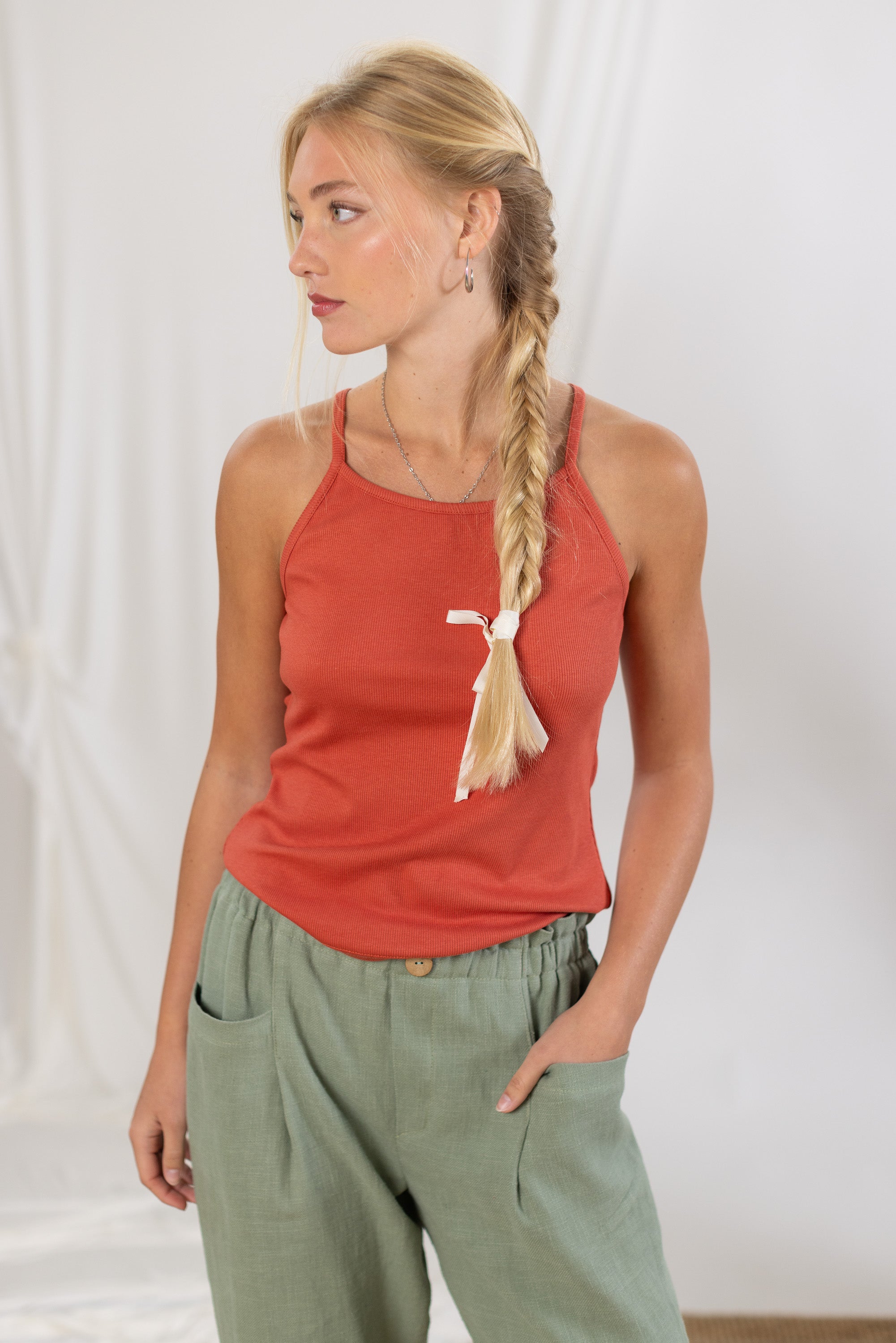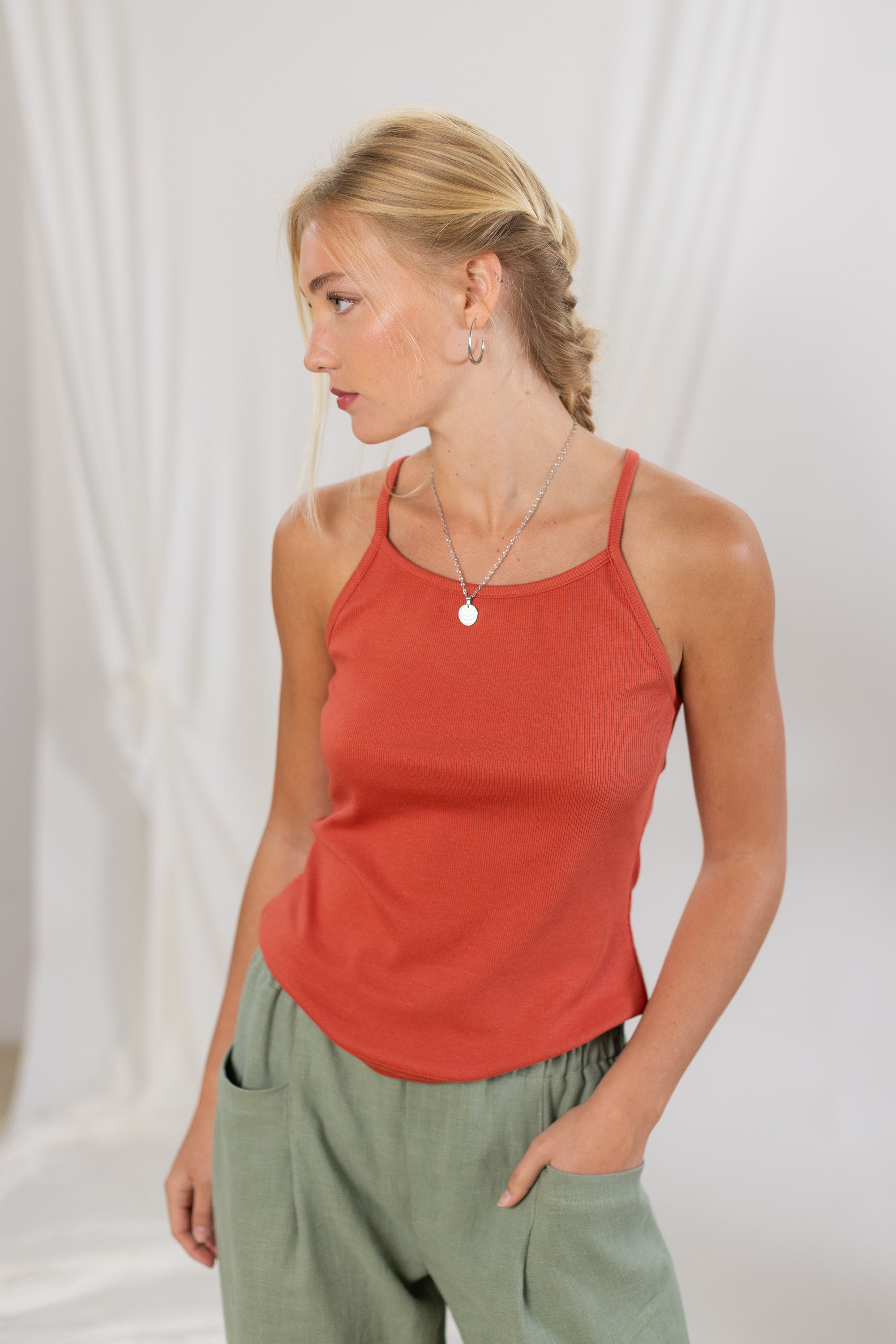 Effortlessly stylish, the Top Chica Sunset Orange features a halter neck design and comfy ribbed fabric in a sleek orange color. Achieve a flattering fit and elevate your wardrobe with this essential piece.